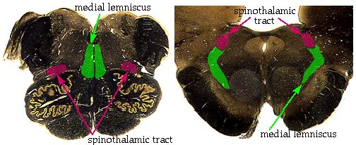 The spinothalamic tract ascends the entire length of the cord as shown above, and the entire brainstem, staying in about the same location all the way up. Below are representative slides showing the tract in the medulla and midbrain. Notice that by midbrain the spinothalamic tract appears to be continuous with the medial lemniscus. They will enter the VPL of the thalamus together.